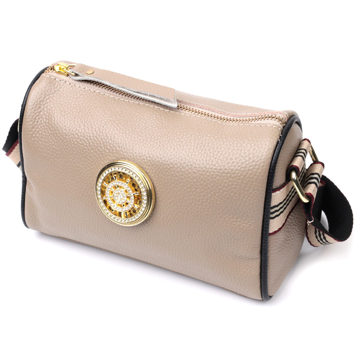 Сумка для стильних жінок із натуральної шкіри з високим показником якості та зносостійкості. На лицьовій стороні розташована кругла прикраса з камінчиками, що надає сумці стильного та вишуканого вигляду. Аксесуар складається з одного основного відділення, потайної кишені на блискавці, кишені відкритого типу та кишені на блискавці зовні. Носити сумку можна на плечі і через плече, для цього є текстильний ремінь, що не знімається. У виробі використано якісну фурнітуру кольору жовтого золота. Універсальний варіант сумки як на вечір так і як сумочка на кожен день.